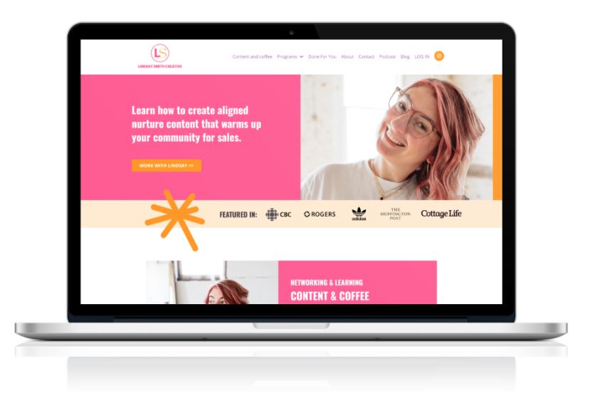 This vibrant website design perfectly captures Lindsay's energetic personality with bold pink and orange branding. The custom design includes everything from logo creation to a complete visual identity, with dedicated pages for each service offering and an email marketing sequence that matches the brand's friendly, approachable voice!